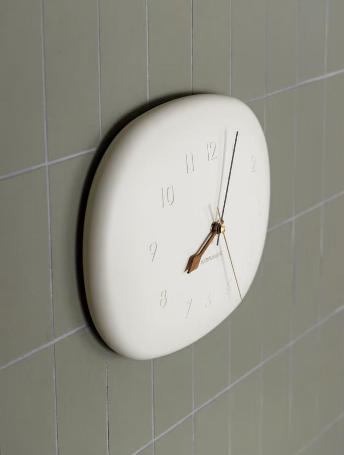 数字と木製の針を合わせた、wall clock。四角と楕円の間の、