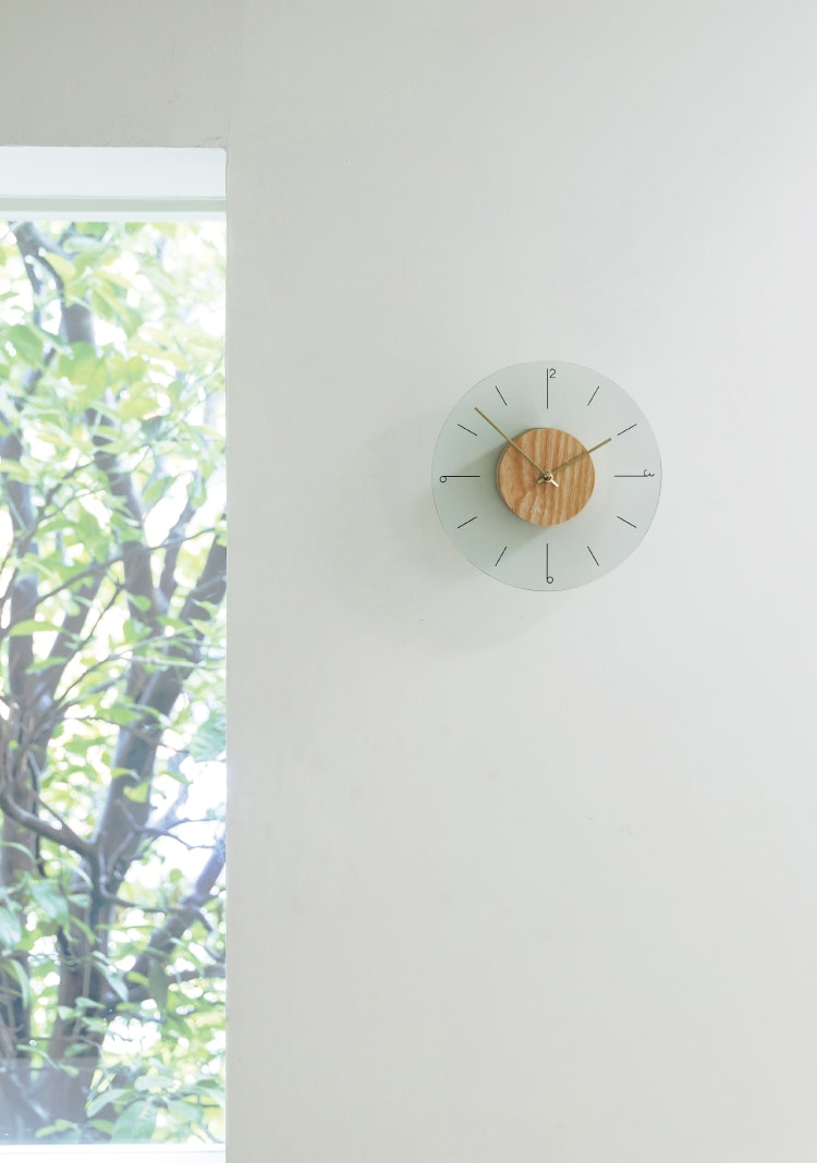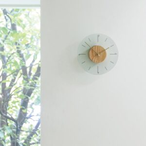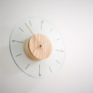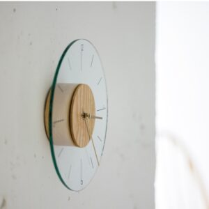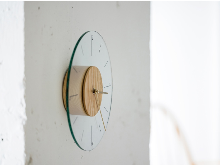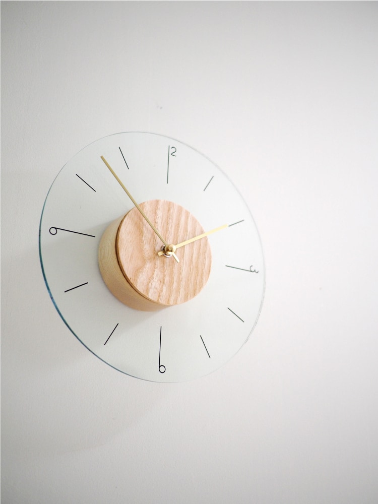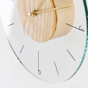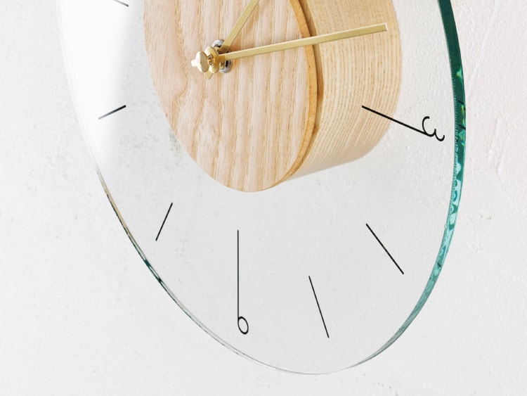 設計された wall clock。木の温もり、少し碧がかったガラス、