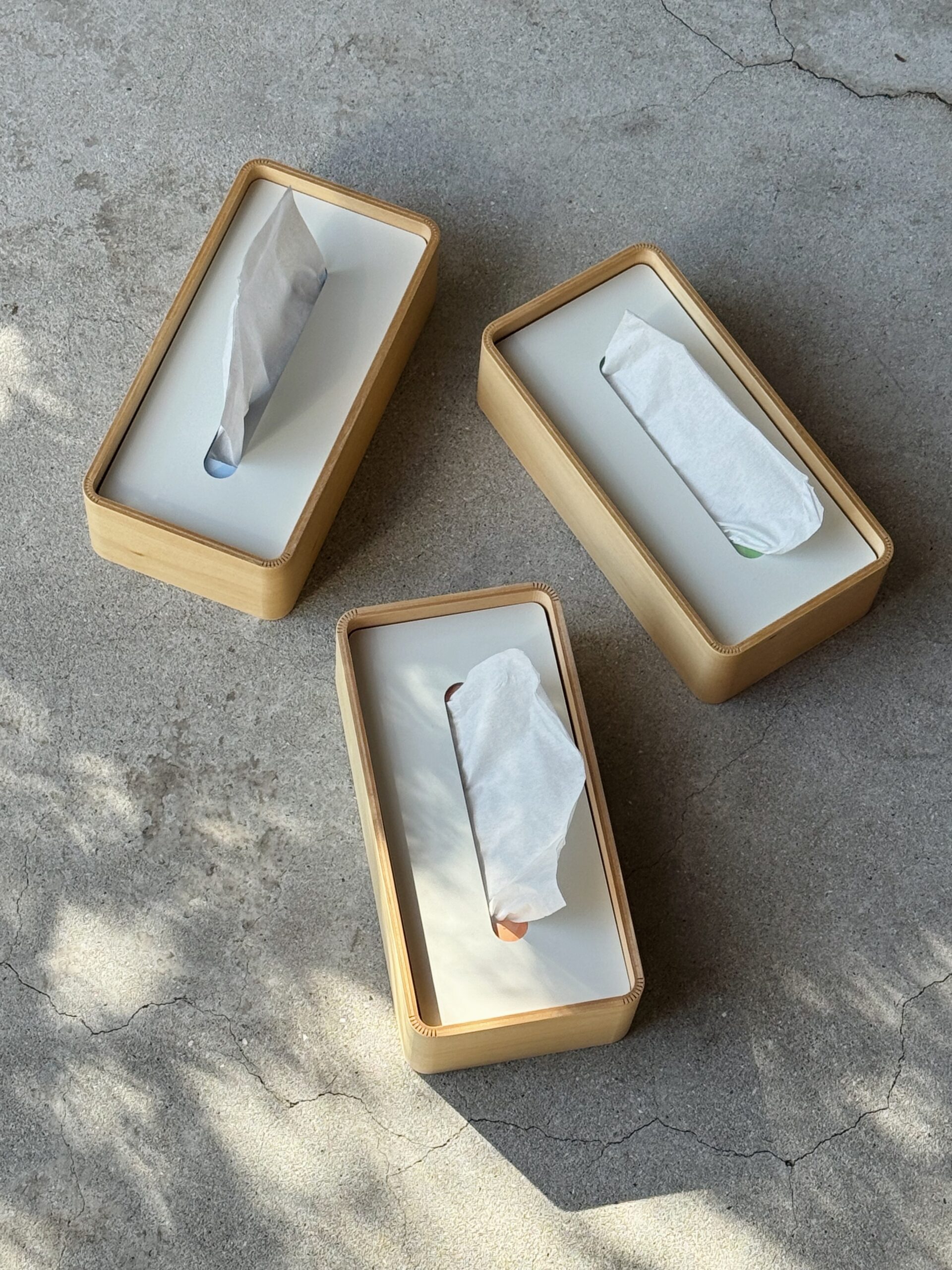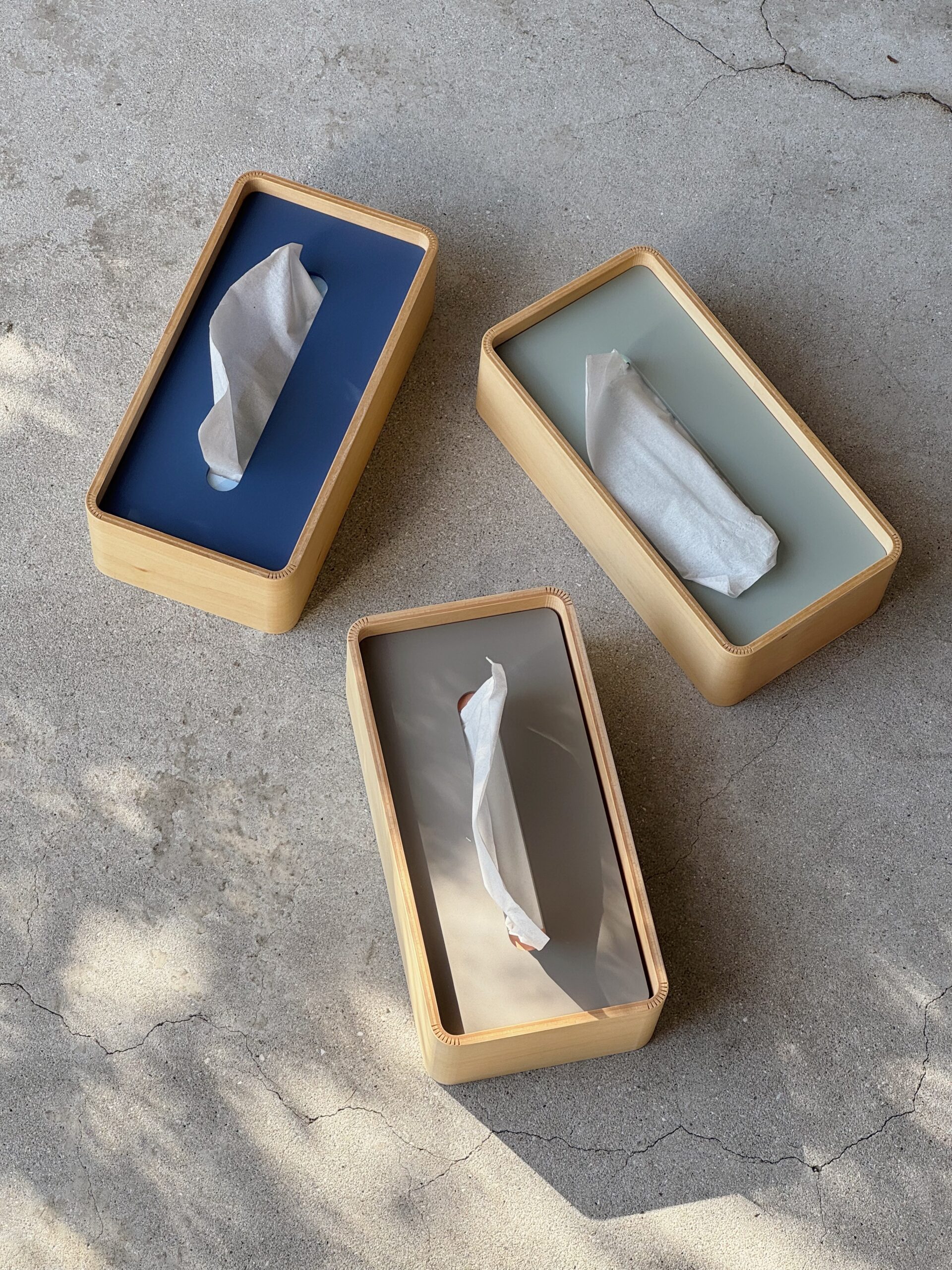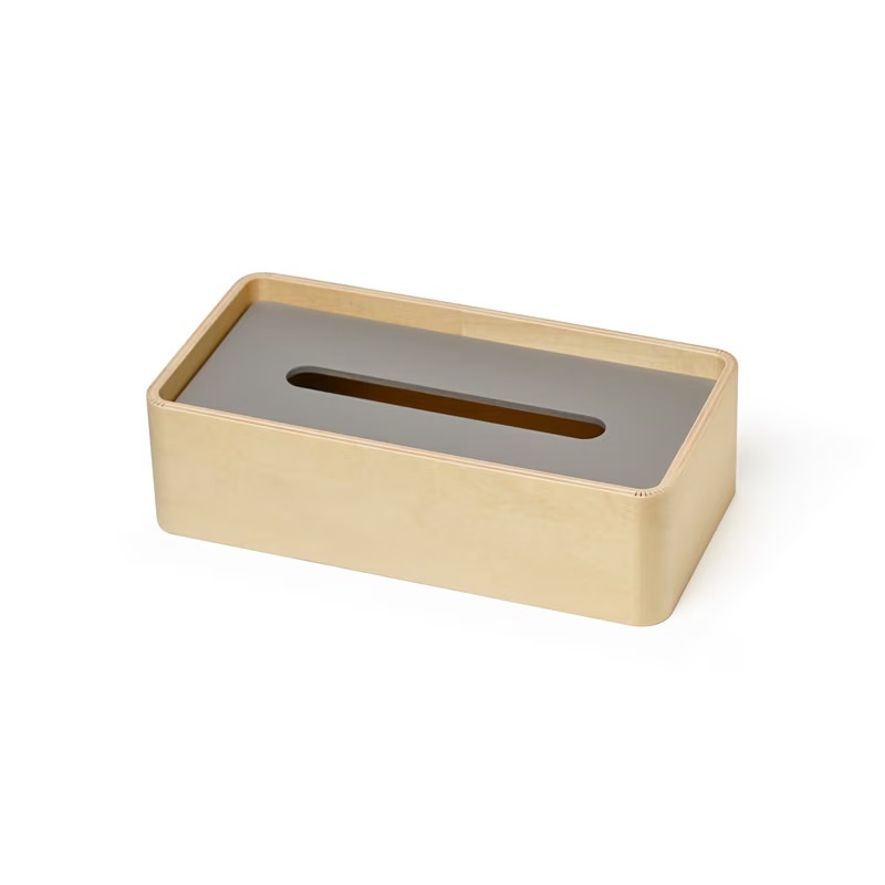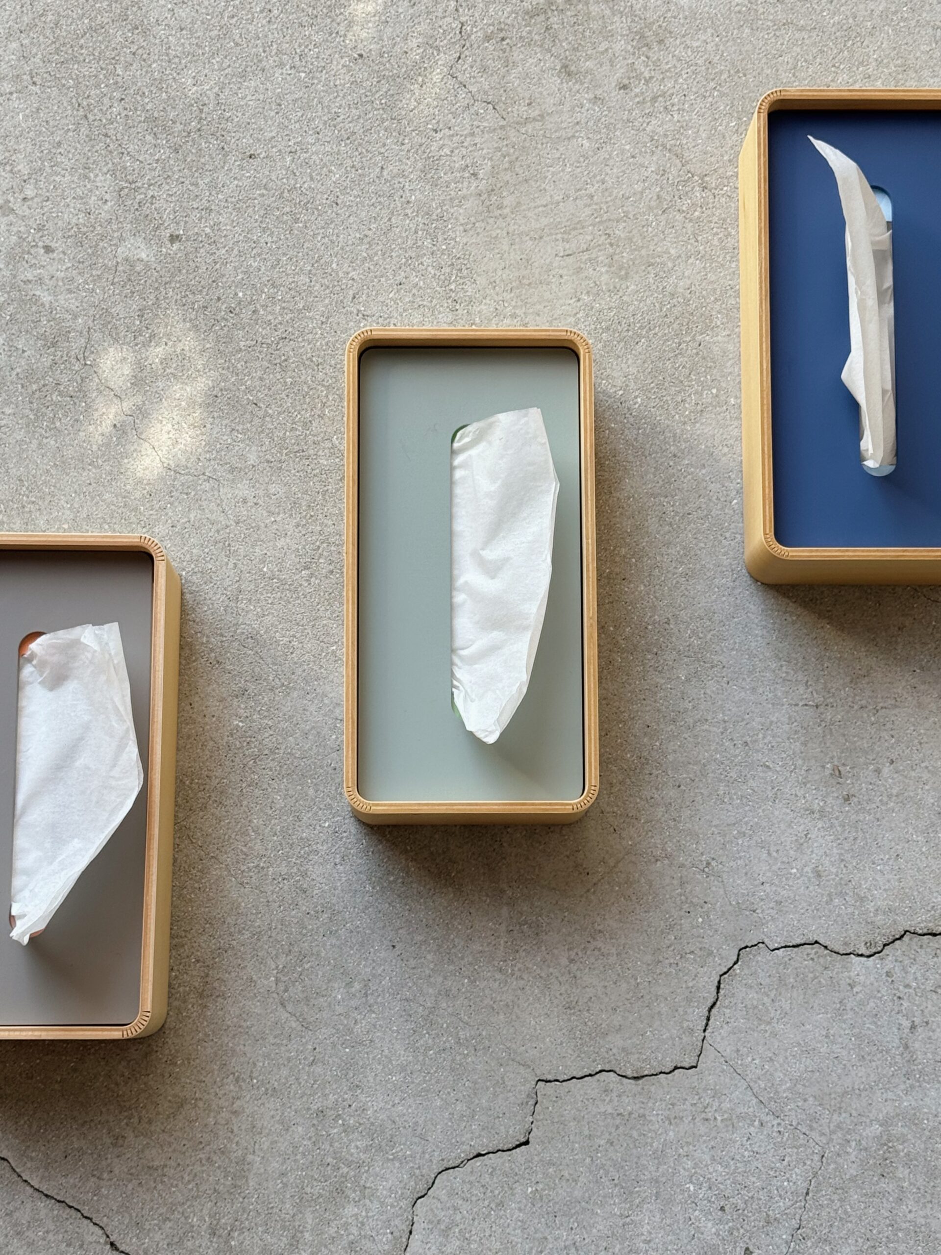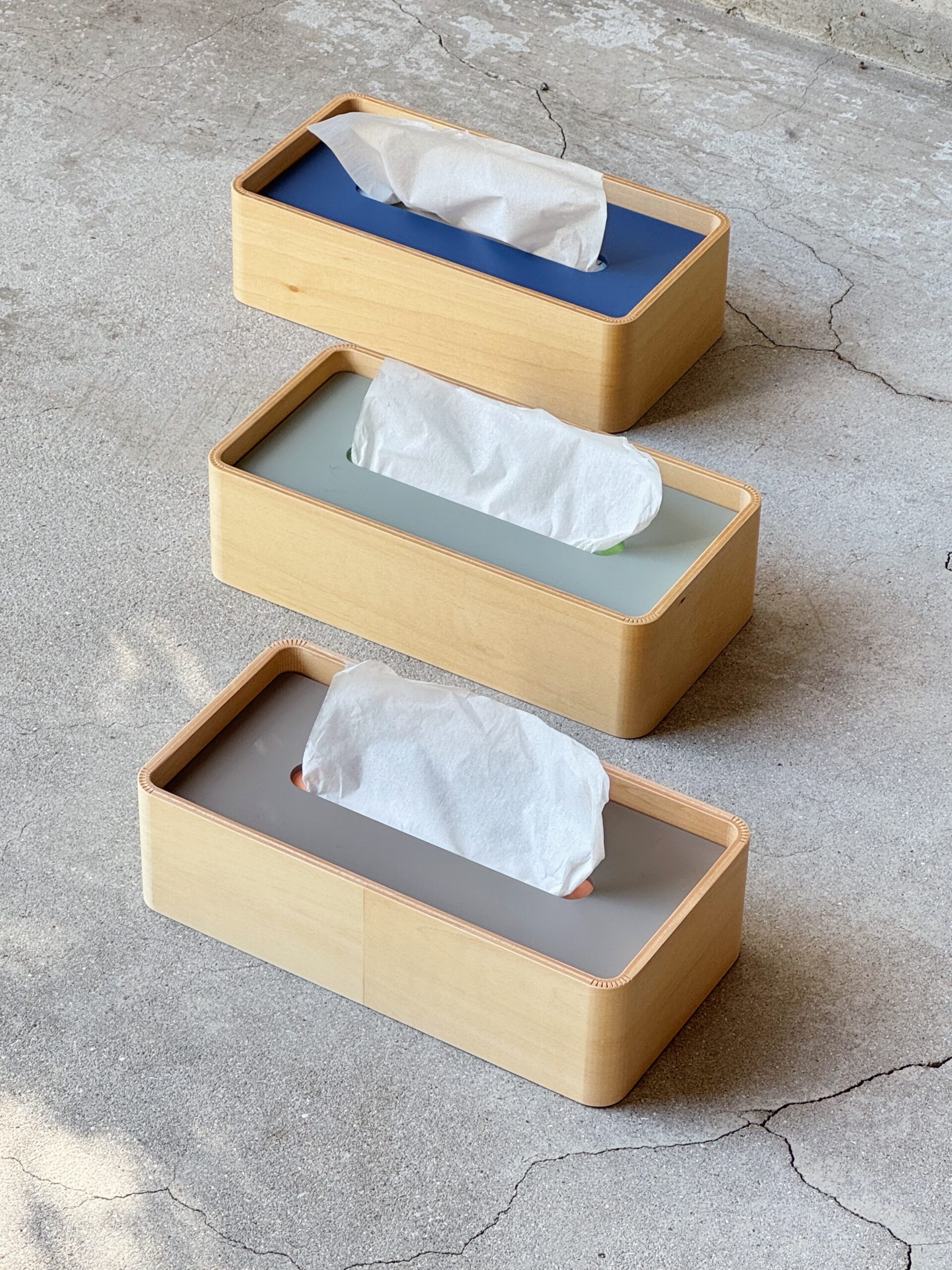 日本の熟練した職人によって丁寧につくられた、 素材感の美しいティッシュケース。 メインカラーを、落ち着きある色合いに。 反対面は合わせやすいアイボリー色で、 気分によってオモテ、ウラと どちらでもお使いいただけるリバーシブル仕様。 曲げ加工が行える「成形合板」を採用する事で、 この美しいフォルムが出来上がっています。