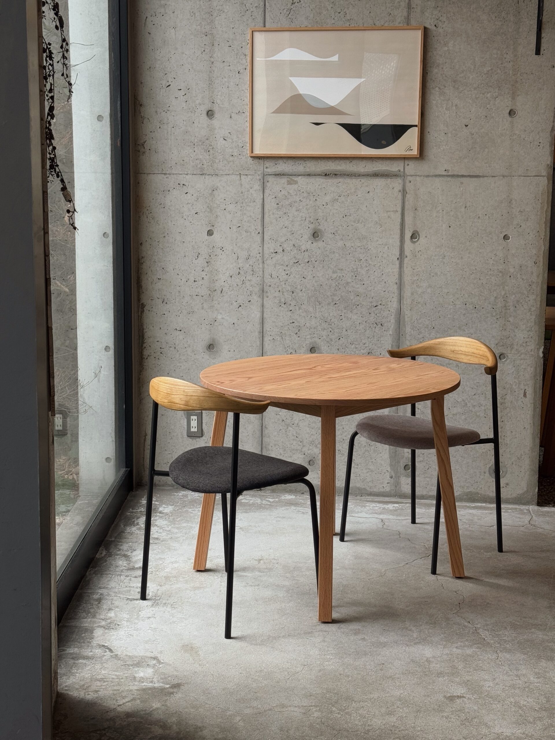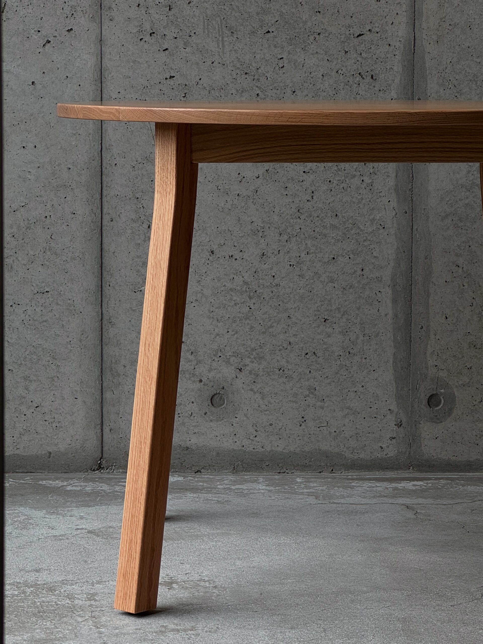 ダイニングテーブル。斜めに配置された直線的で軽やかな脚と、