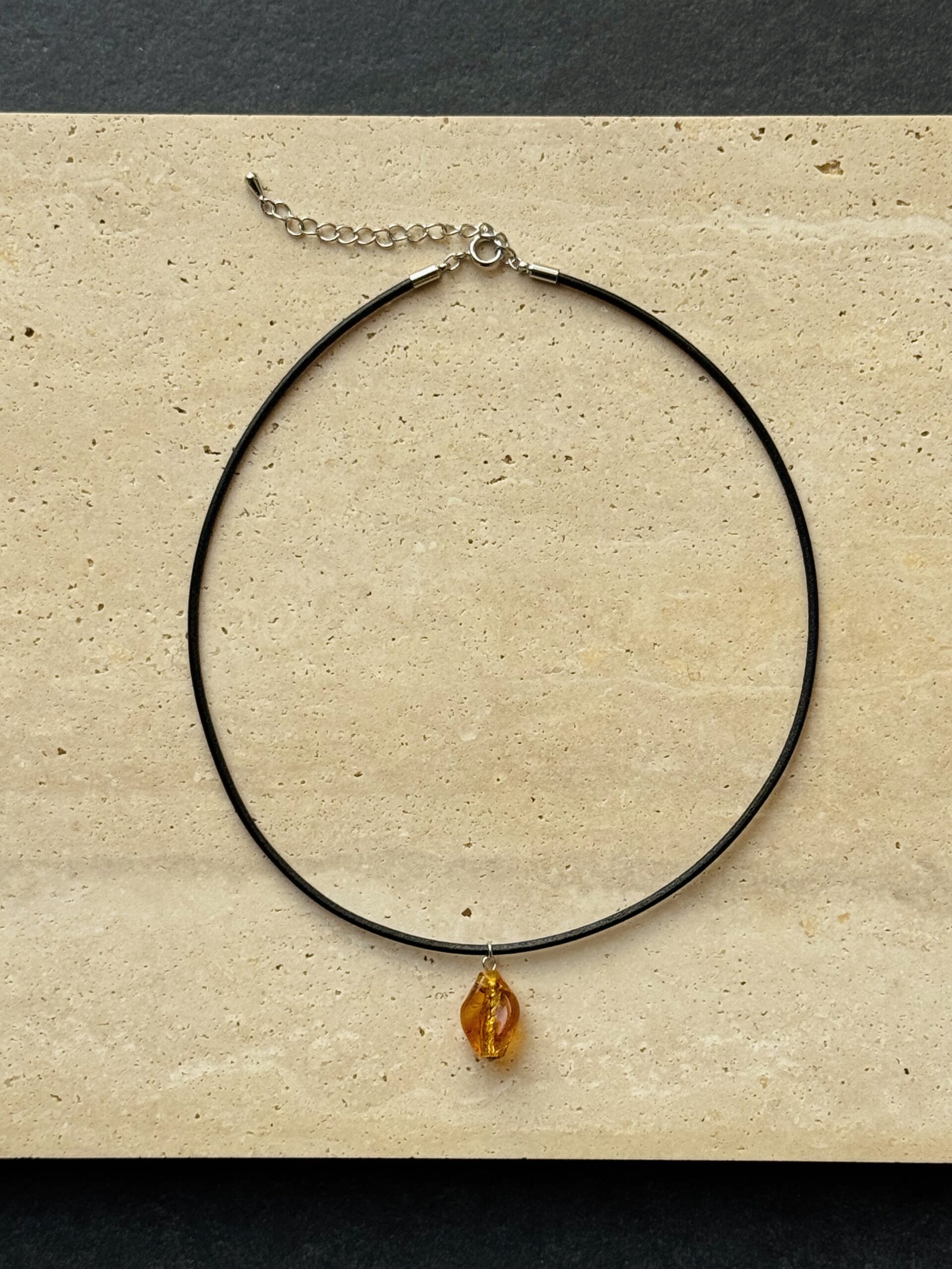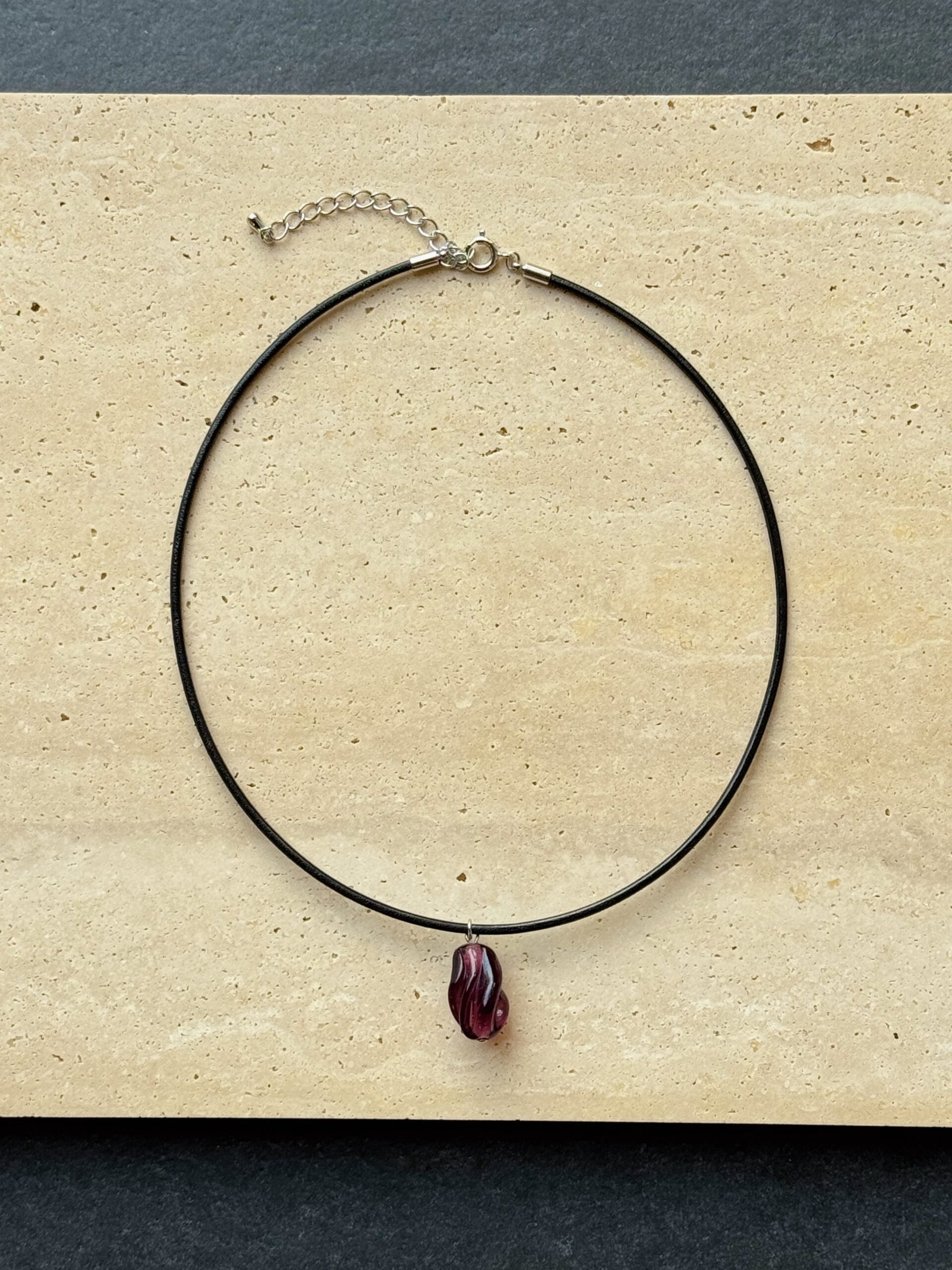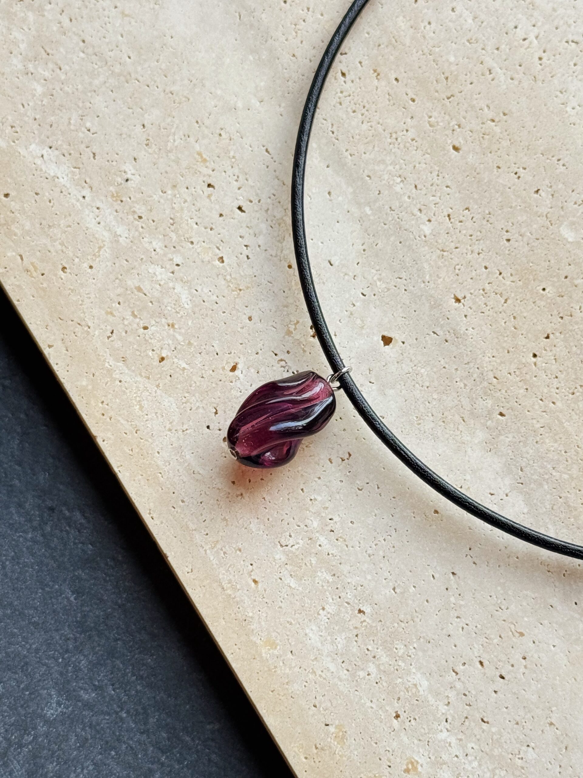 シンプルなレザーコードに、 艶やかなガラスの一粒。