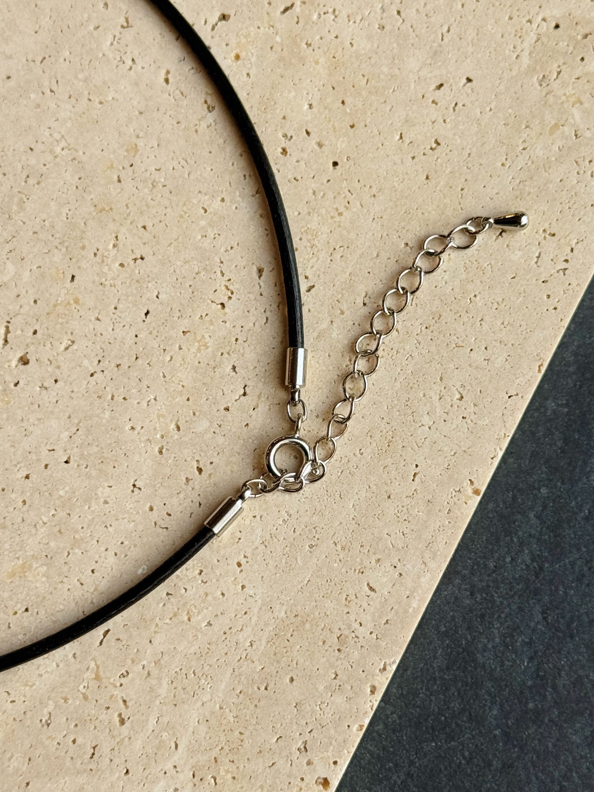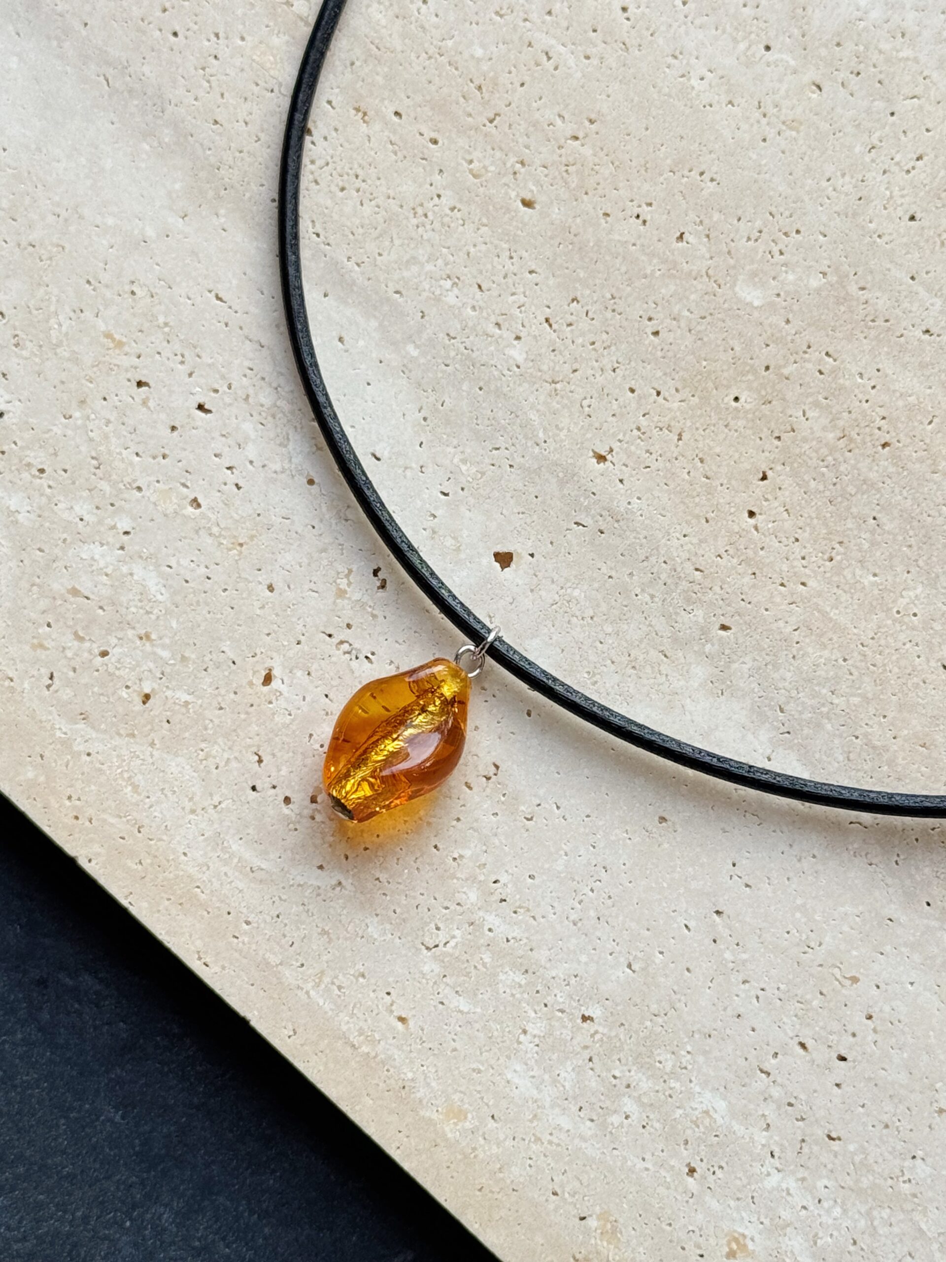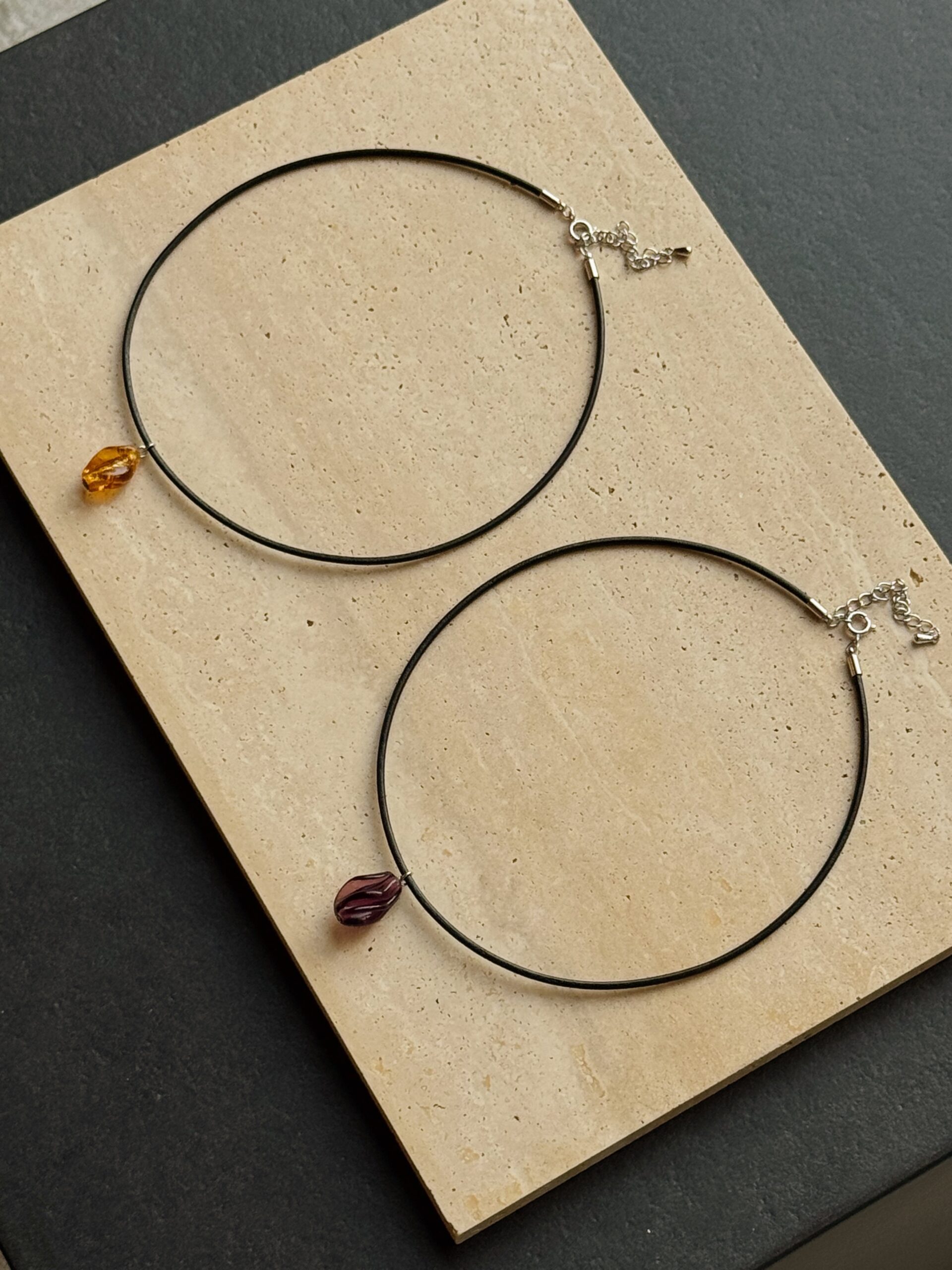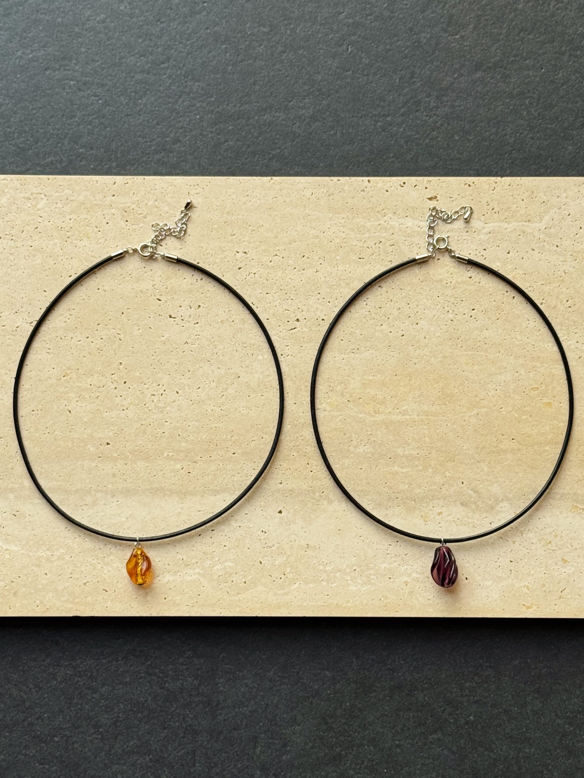 シンプルなレザーコードに、 艶やかなガラスの一粒。