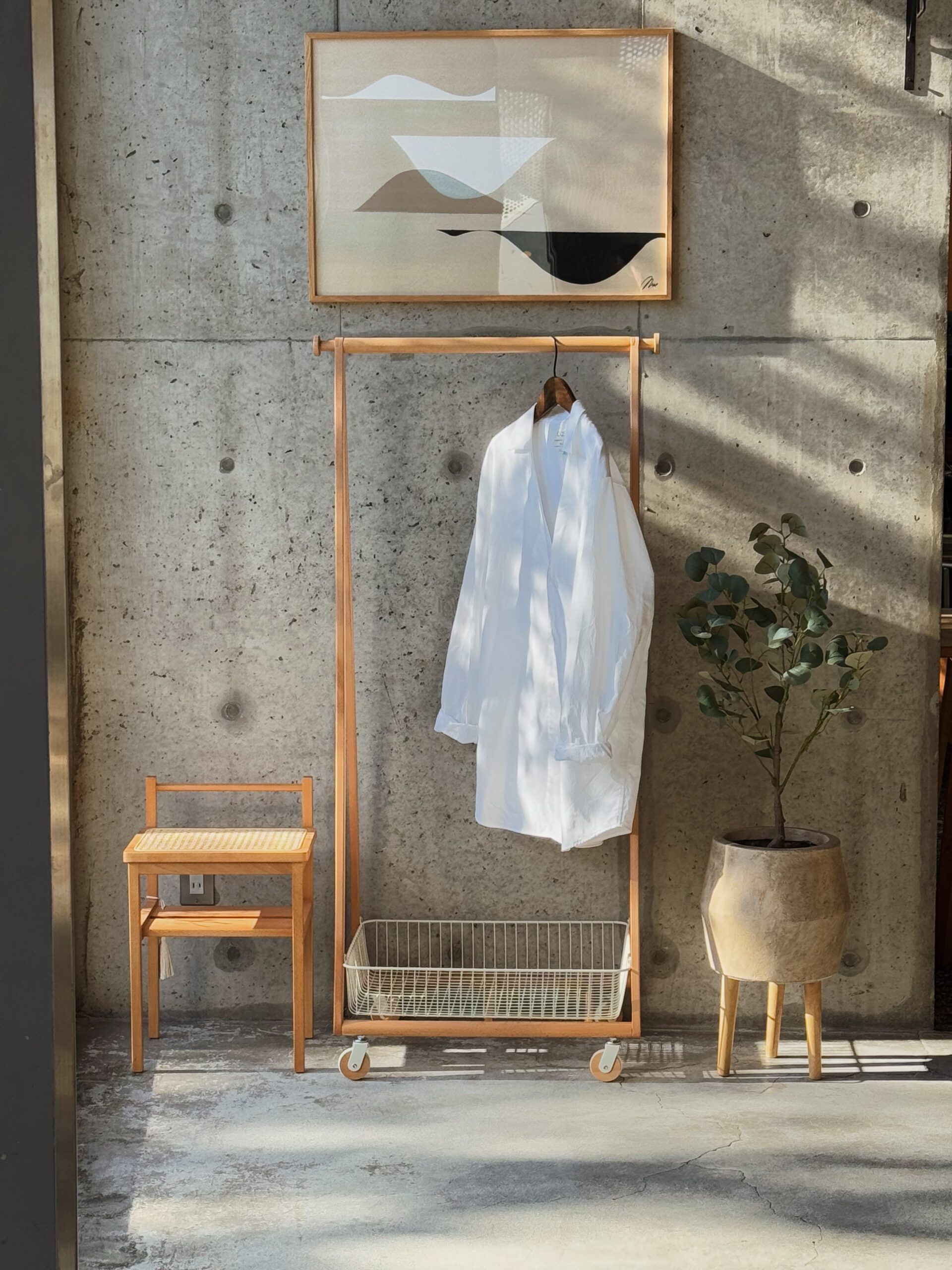 ワンピースなども掛けることができます。バスケット部分には、よく使うバッグや